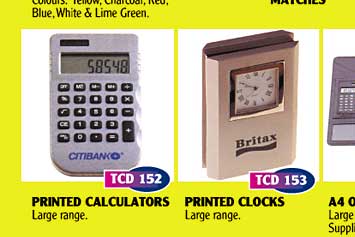 | TCD144 - Printed Balloons and Balloon Accessories Large range of balloon colours. TCD145 - Drink Coasters Printed cardboard coasters. Different shapes available. TCD146 - Printed BIC Lighters Australia's No.1 selling lighter. Assorted colours. TCD147 - Cork Backed Drink Coasters Finished in a gloss white heat resistant laminated top. TCD148 - Printed BIC Clic Pens Colours: Yellow, Charcoal, Red, Blue, White and Lime Green. TCD149 - Printed Book Matches TCD150 - Printed Standard Waiters Friend Colours: White, Burgundy, Green and Black TCD151 - Cardboard Sunvisors Printed in any colur. TCD152 - Printed Calculators Large Range. TCD153 - Printed Clocks Large range. TCD154 - A4 or A5 Conference Folders Large range available. Supplied with or withour Calculators. TCD155 - Satchels Screenprinted. Large range available. TCD156 - Promotional Folding Chairs wiht Carry Bag Screenprinted. Colours: Navy, Bottle Green, Red, Black, Royal and Yellow. TCD157 - Thermo Cups Polypropylene shatterproof if dropped. Microwave and dishwasher safe. Colours: White, Jade, Pink, Yellow, Red, Blue, Bottle Green, Brown and Black. TCD158 - Sports Socks Design knitted into socks. Sizes - Ladies 2-8, Mens Regular 6-11, Mens King size 10-12 TCD159 - Promotional Fridge Magnets 1 or 2 colour prints. We also do 4 colour process fridge magnets. |